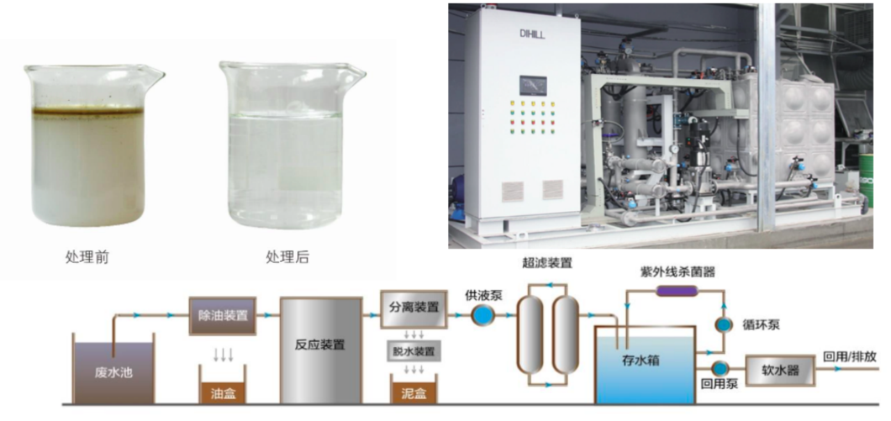 待處理的壓鑄廢水經過系統出來后分為回用凈水、回收廢油、廢泥,系統可以實現自動化運